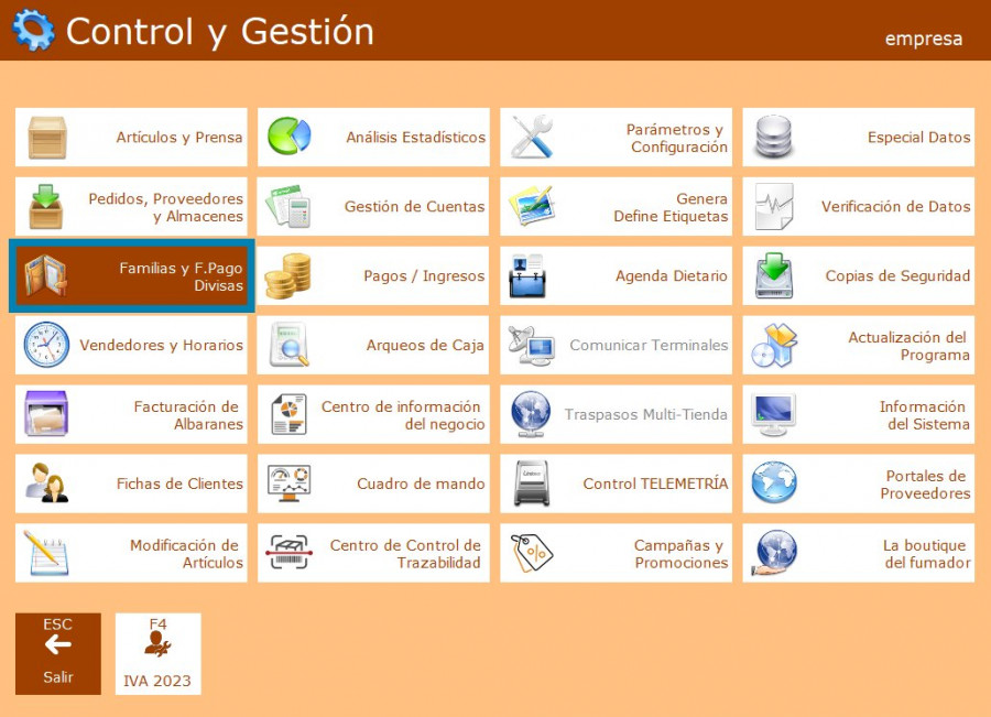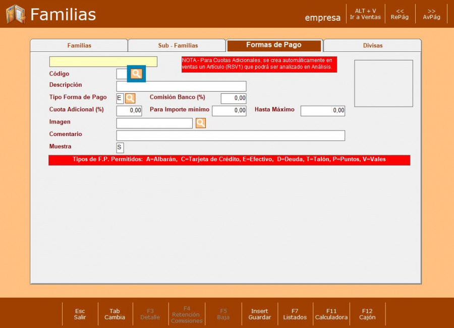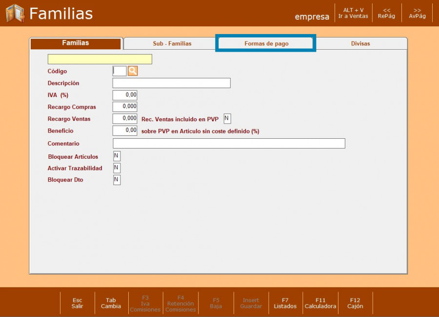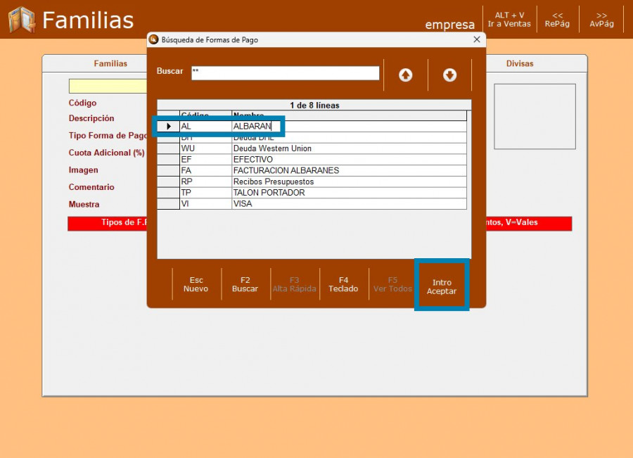 PASO 2: Seleccionar Familias y F. pago divisas.