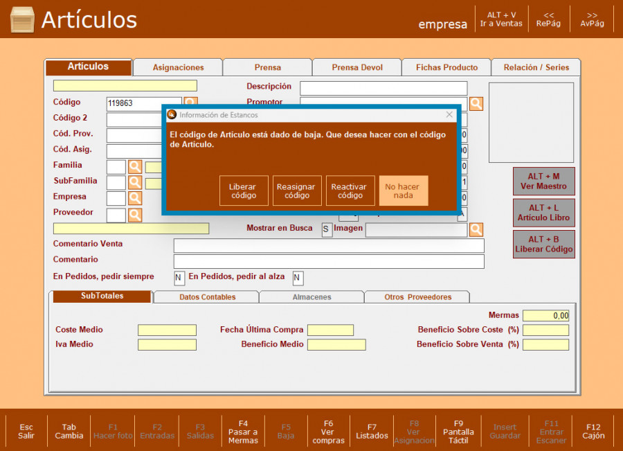 Si al acceder a la sección de "Artículos" y al poner el código del artículo aparece una ventana indicando que el código del artículo está dado de baja, y se presentan cuatro opciones: "Liberar Código", "Reasignar Código", "Reactivar Código" y "No Hacer Nada",