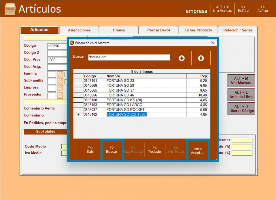 PASO 6: Buscar el producto en el maestro del proveedor pulsando “F2" e introduciendo el nombre del producto. Seleccionar el producto deseado cuando tengamos seleccionado el producto pulsamos “Intro/Aceptar”.
